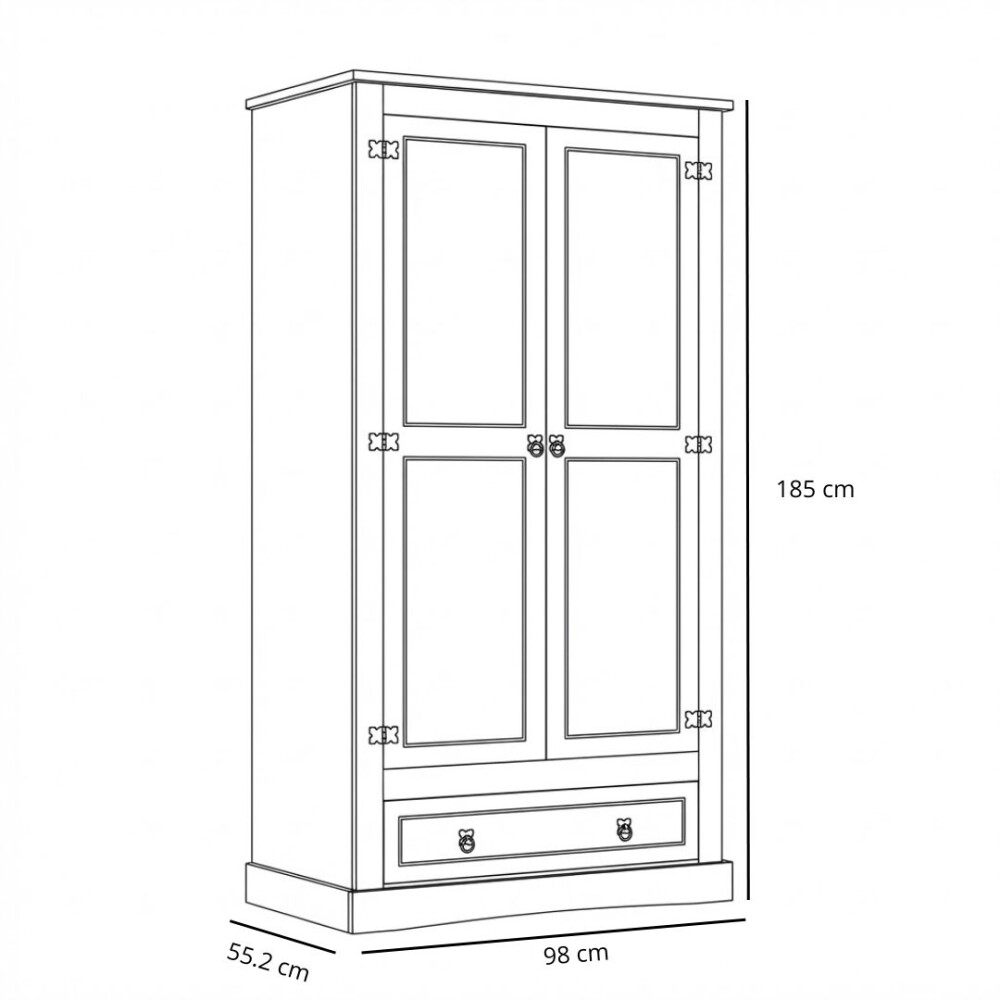 Ropero de 2 puertas en madera maciza, con estantes y perchero interior, ideal para organizar tu ropa con estilo y calidez. Su diseño robusto y acabado clásico aporta un toque elegante y funcional a tu dormitorio.